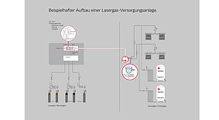 Weiterhin sollten diese Druckminderer zweistufig ausgelegt sein. Einstufige Druckminderer haben im Verlauf der Flaschenentleerung keinen konstanten Hinterdruck. Dieses ist aber für den Laser wichtig, weil bei Überschreitung des Hinterdrucks über den Druckwächter eine Fehlermeldung ergeben würde, die zum Stillstand der Maschine führen kann. Vom Druckminderer bis zur Laseranlage sollten kurze Schläuche oder feste Verrohrungen aus Edelstahl oder Kupfer hoher Qualität verwendet werden. Wenn Schläuche eingesetzt werden, sollten diese keine Feuchte oder Umgebungsluft hindurch diffundieren lassen. Weitere Störfaktoren könnten ausdiffundierende Lösungsmittel aus den Schläuchen sein. Die Verrohrungen sollten alle formiert gelötet und einer anschließenden Dicht- und Festigkeitsprobe unterzogen werden.